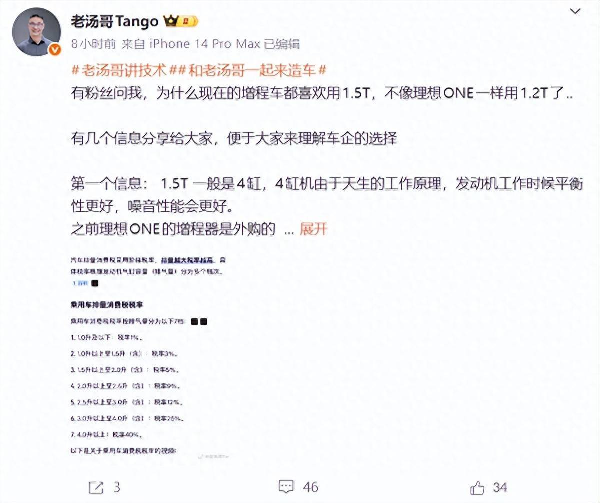 理想汽车产品线负责人汤靖@老汤哥Tango发文称,有粉丝问他,为什么现在的增程车都喜欢用1.5T,不像理想ONE一样用1.2T了?他在此给大家分享几个信息,便于大家来理解车企的选择。
